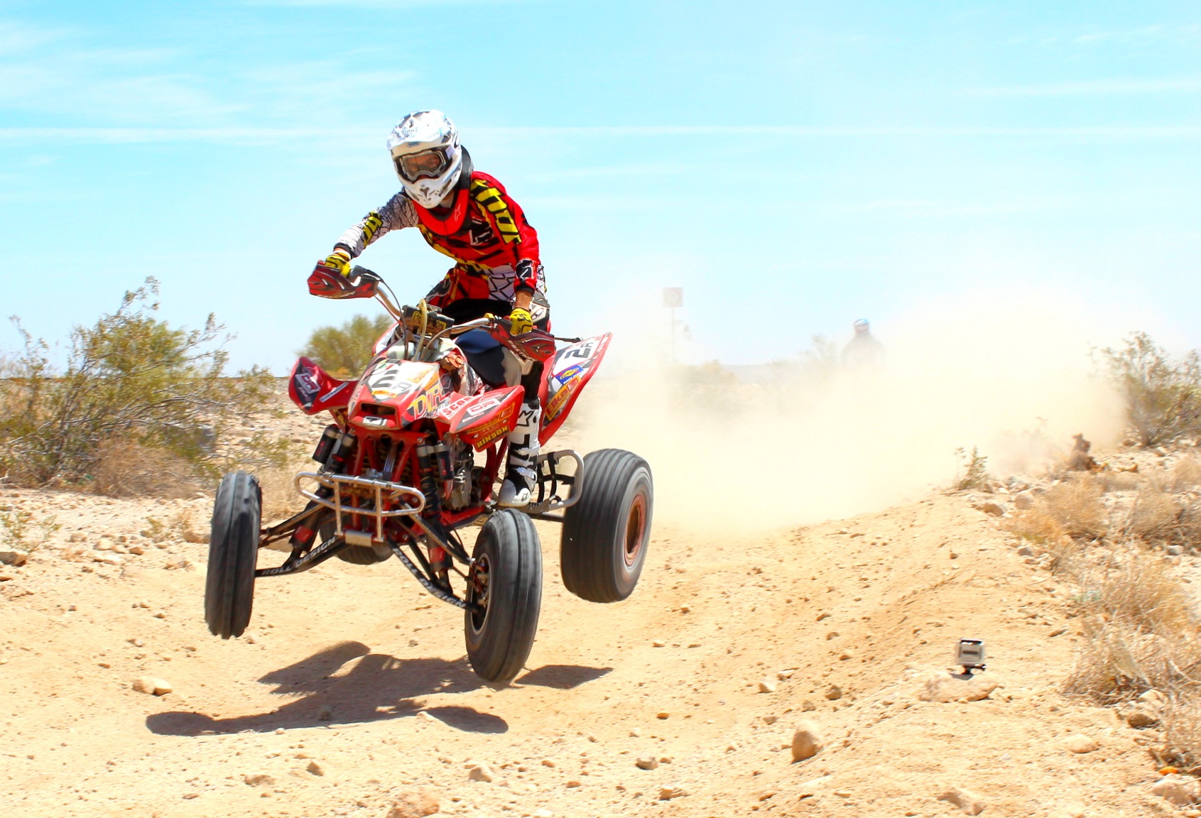 The green flag dropped for my good friend and rider Manlio Diaz at 6:18:30 am. He had a good run for the first 40 miles and Manlio rode the quad to my lithe nephew Jose Luis and took off like a bullet but he had a little accident at mile 60; his right foot went down and the rear tire grab his foot. Didn’t take too long for him to recover and he was back into the race until mile 100 where it was time for my friend Stefano Caputo to ride the hard summit. 20 miles before his last section he went down when he was about to pass an ATV in the dust. He missed a turn and it took him about 10 minutes to get back into the race. Mile 160, we checked the quad and it was time for Felipe Velez to ride with only 50 miles to go for his first section. He needed to ride like a stolen quad in the hot desert to get back in the fight and got very close to 8a at mile 201. Felipe handed the quad to his 16 years old nephew Jose Luis and he passed Dustin Nelson before mile 230 but we did a major pit stop to make sure our quad was ok for the next 70 miles since Felipe will be on board without help around. He had a clean ride and handed the quad to Manlio to ride 30 miles. At mile 330, Mario Diaz got on the quad and had a good fast run. The quad ran without problems during the whole 500 miles and the team did a great job to keep the quad going all the way to the finish line and brought home the 3rd place.