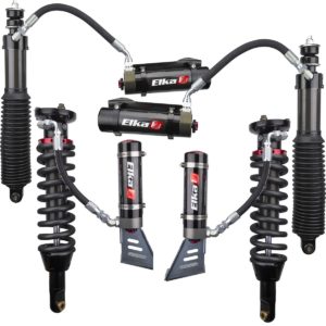 Top of the line from Elka, featuring external reservoirs with dual-compression adjustability, adjustable preload on front coilover shocks